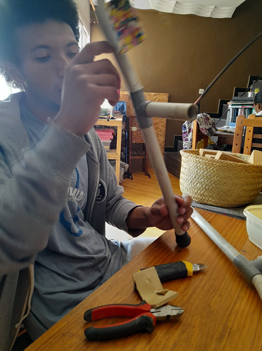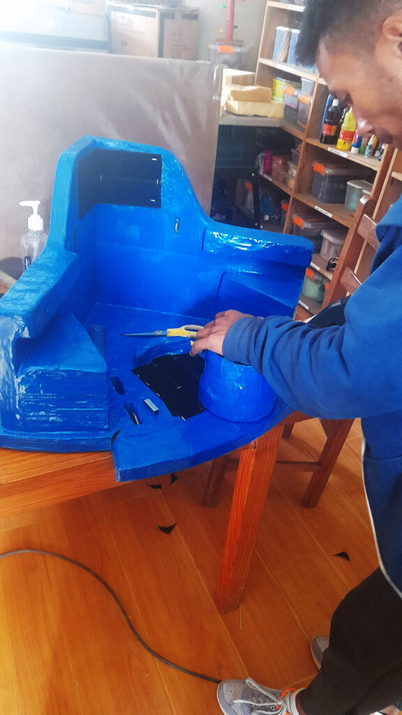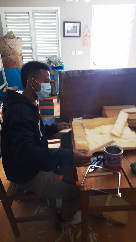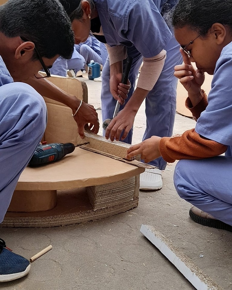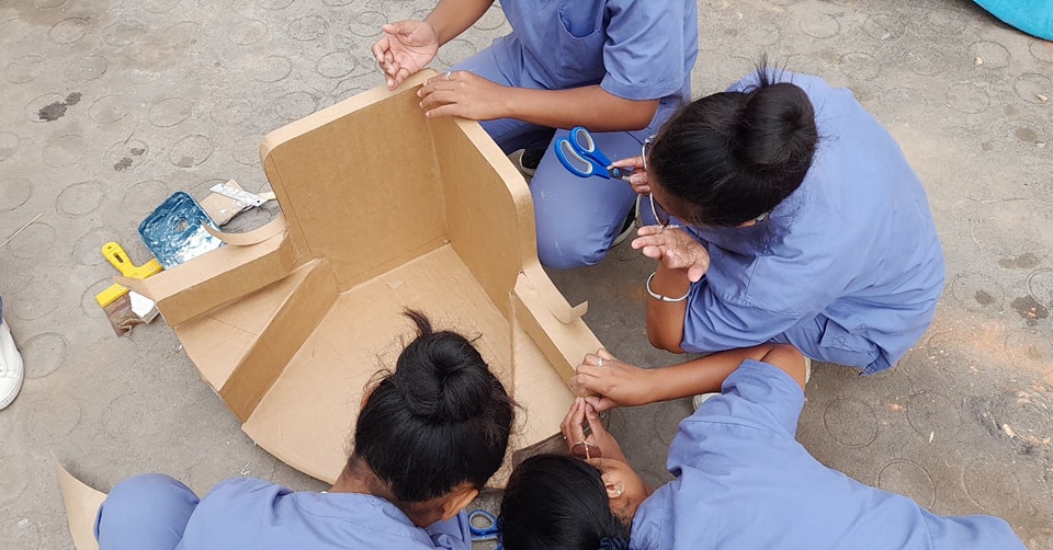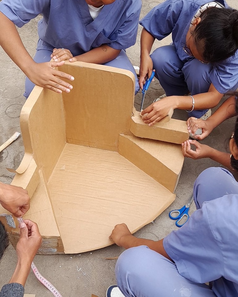 The occupational therapists building a corner chair out of cardboard for a child with cerebral palsy